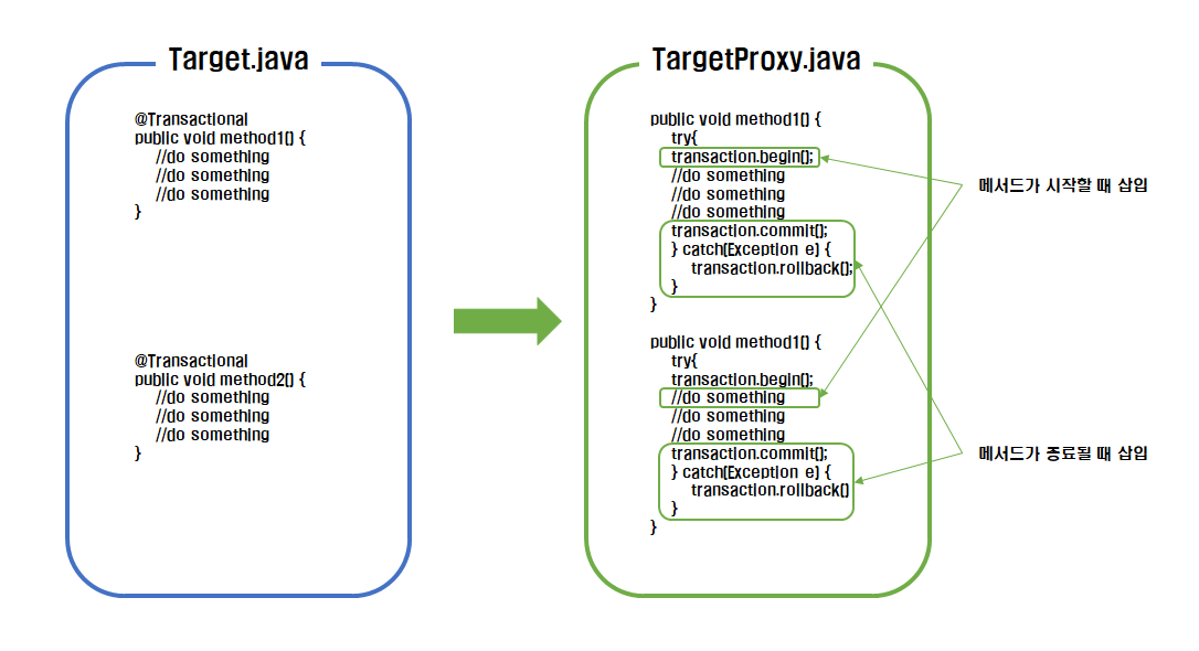 트랜잭션의 범위가 확장되는 1번 방법의 단점을 보완할 수 있지만, 프레임워크에서 수행되는 작업을 미리 예상하고, 해당 클래스가 자신을 상속한 프록시 객체에 의존하는 구조를 가지게 됩니다.