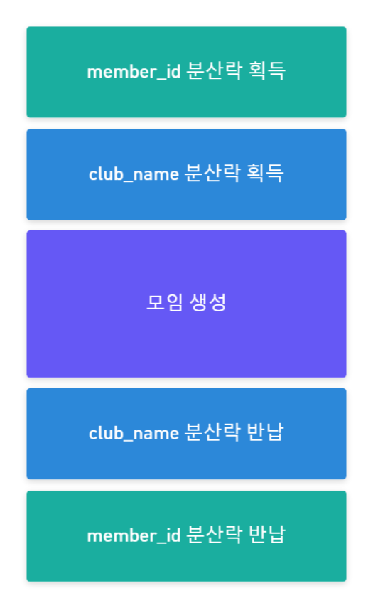 모임을 생성하는 요청은 우선, 회원에 대한 분산락을 획득하여 한 회원이 모임 생성 제한 갯수를 초과하여 생성하는 것을 검사합니다.