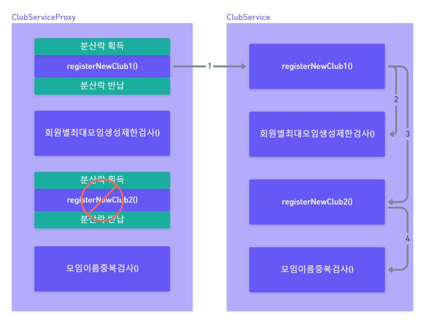 먼저 분산락을 사용하는 메서드가 다른 분산락이 적용된 메서드를 호출하는 경우, AOP가 적용된 프록시의 메서드가 아닌 실제 타깃인 ClubService의 메서드를 호출했습니다.