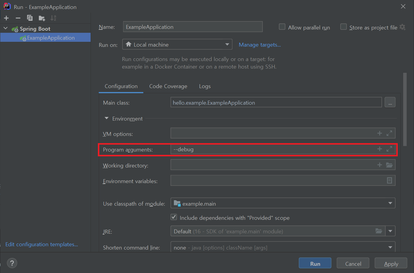 - 'configuration -> environment'에서 다음과 같이 Program arguments에 '--debug'를 입력합니다.