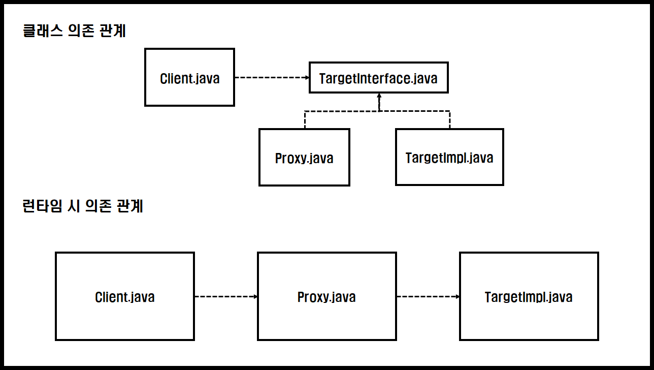- Proxy.java - TargetInterface를 선언하며 타깃의 핵심 로직 전후에 로그를 남깁니다.