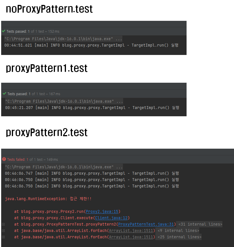 proxyPattern2.test도 마찬가지로 client.execute()가 4번 호출되었지만, 프록시에서 3번째 접근후에는 예외를 던져 접근을 제한했기 때문에 3번째 로그를 남긴 후 예외가 발생했습니다.