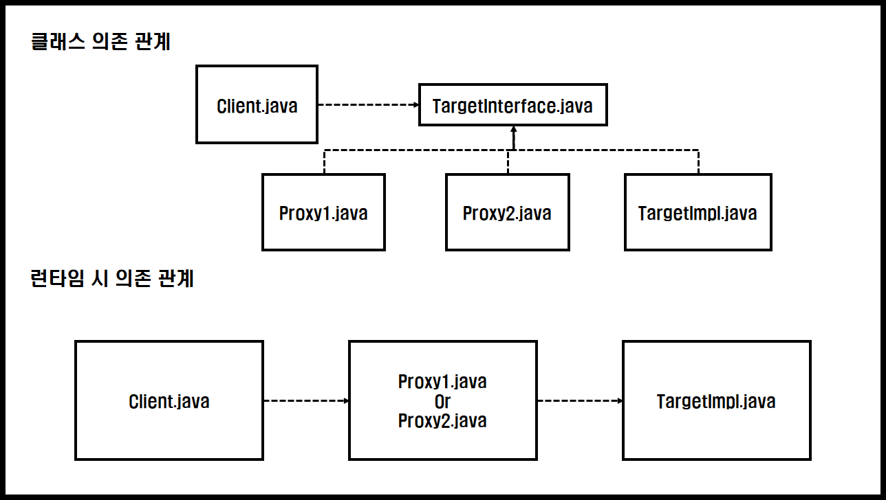 객체가 프록시가 되려면 클라이언트는 요청을 보낸 대상이 타깃인지 프록시인지 구분을 할 수 없어야 합니다. 즉, 타깃과 프록시는 같은 인터페이스를 확장해야 합니다.(CGLib처럼 구현 클래스를 상속받는 방법도 있습니다..) 이로써 느슨한 연결을 유지하며, OCP원칙을 통해 좋은 코드를 작성할 수 있습니다.