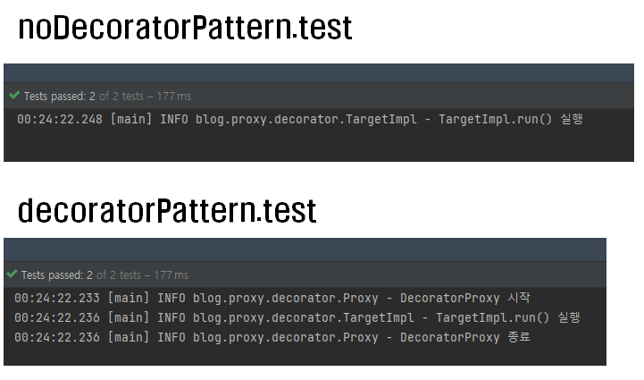 log.info("DecoratorProxy 종료"); //부가적인 기능을 부여하는 것이라 가정합니다.