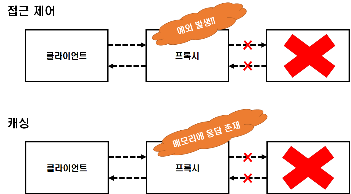 마지막으로 캐싱(cache)이 가능합니다. 타깃으로부터 응답으로 받은 데이터가 메모리에 존재할 때, 프록시는 타깃으로 요청을 보내지 않고, 기존 응답의 데이터를 클라이언트에게 전달할 수 있습니다.