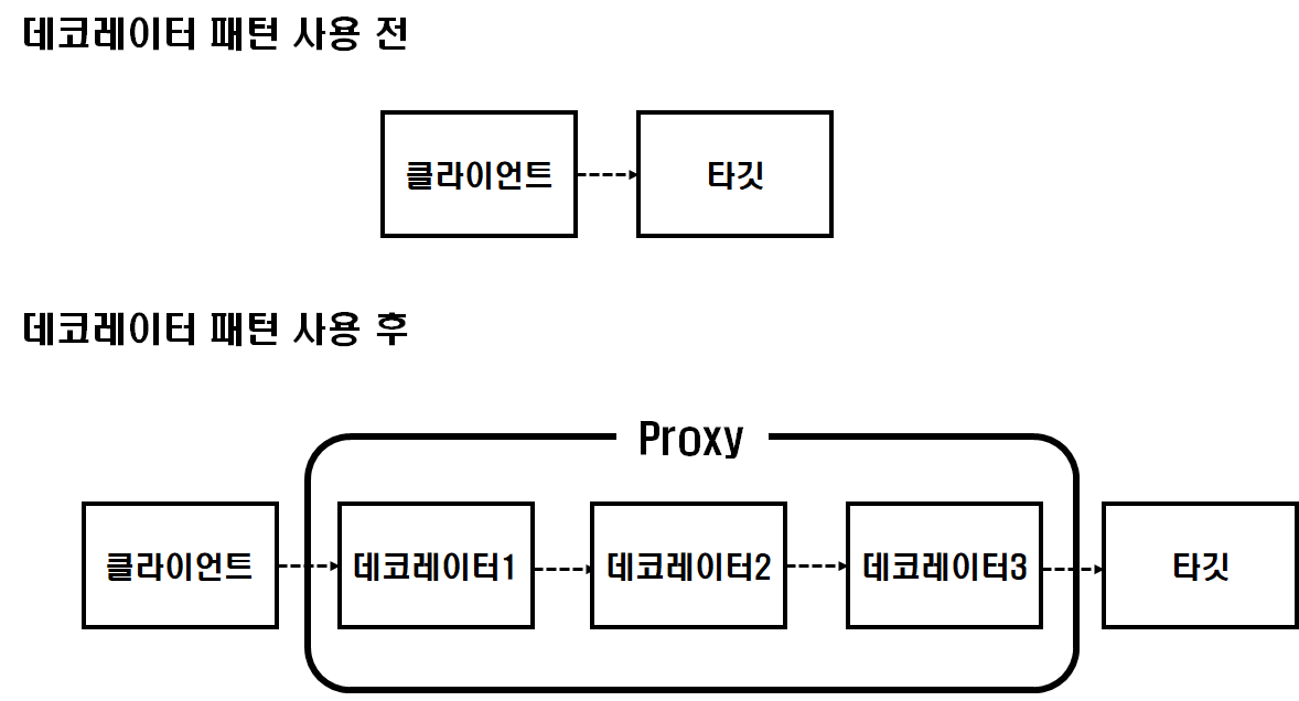 데코레이터 패턴은 타깃에 부가적인 기능을 런타임 시 다이내믹하게 부여해주기 위해 프록시를 사용하는 패턴을 말합니다.