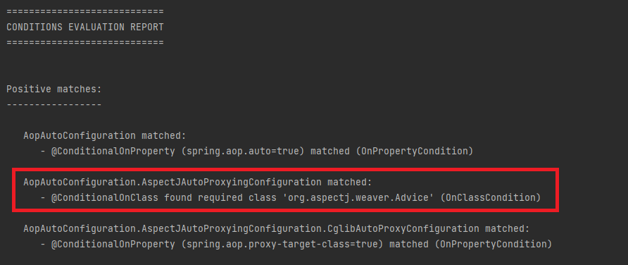 이 라이브러리가 추가되면 aspectweaver라는 aspectJ 관련 라이브러리가 추가되고, 스프링 부트가 AOP 관련 클래스를 스프링 빈에 자동으로 등록합니다. 디버그 모드로 실행해보면 다음과 같이 aop auto-configuration이 적용된 것을 확인할 수 있습니다.