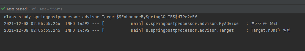 타깃의 run() 메서드를 호출하였는데 부가기능 실행 로그가 함께 출력된 것을 볼 수 있습니다. 또한 target.getClass()의 결과도 EnhancerBySpringCGLIB가 적용되어 프록시가 빈으로 등록된 것을 확인할 수 있습니다.