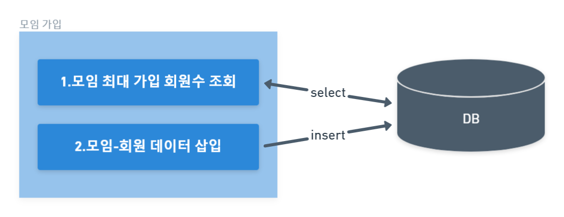 문제인식 개발 중 클라이언트로부터 동일한 데이터에 대한 삽입 요청이 동시에 들어오는 경우, 중복 데이터 검사 로직을 거치더라도 데이터가 중복 삽입되는 문제를 발견했습니다. 회원이 모임을 가입할 때 발생하는 문제를 예시로 들어보겠습니다. 위와 같은 로직을 거쳐 회원이 모임에 가입하는 경우입니다. 위처럼 클라이언트의 오류로 동일한 두 요청이 동시에 들어온 경우 회원이 한 모임에 중복으로 가입하게 되는 문제가 발생하게 됩니다. 이 문제는 간단하게 Unique 제약조건을 통해 해결할 수 있습니다. 그러나 만약 '모임에 역할을 부여하여 관리자 회원은 관리자 역할과 일반 역할로 중복 가입할 수 있다.'라는 요구사항이 추가되면 다음과 같이 DB의 제약조건을 변경해 주어야 합니다. 또한, 제약조건을 변경하는 불편함을 ..